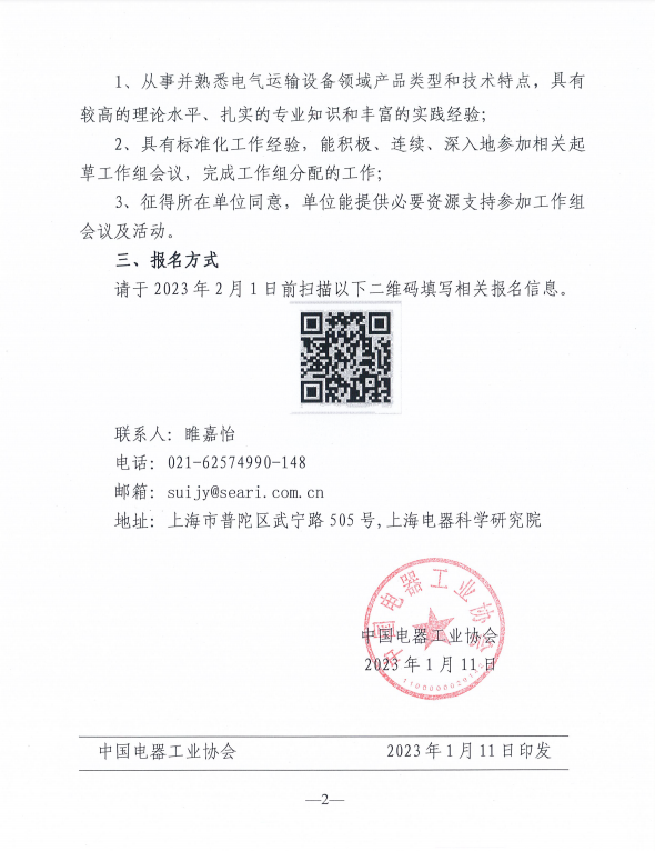 2022年12月13日,国标委发[2022]39号《国家标准化管理委员会关于下达2022年第三批推荐性国家标准计划及相关标准外文版计划的通知》,下达了国家标准《电气运输设备 术语和分类》制定计划(计划号: 20221435-T-604)。为保证标准编写质量,现面向行业征集标准起草工作组。
