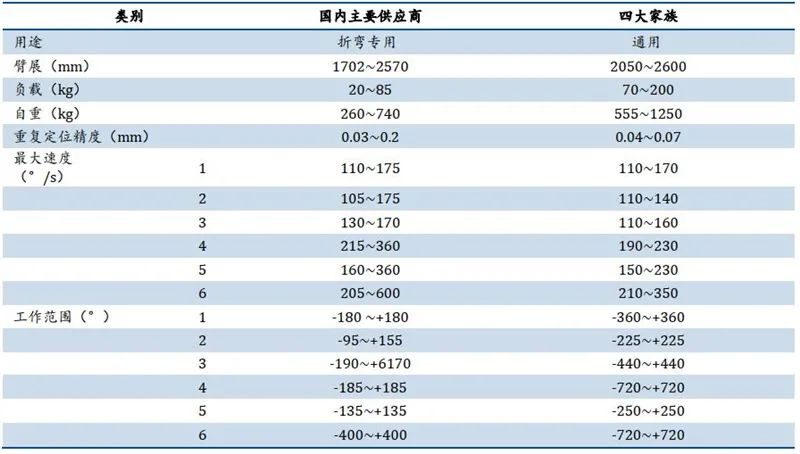 中小负载折弯领域,国产机器人重复定位精度、臂展距离以及最大速度参数与“四大家族”产品接近。国内主要供应商的中小负载焊接机器人重复定位精度约为 0.03-0.1mm,接近四大家族产品精度(0.04-0.07mm); 臂展方面,国内主要供应商的中小负载焊接机器人最大工作距离能达到 2500mm 以上,与四大家族差距较小(2600mm);最大速度方面,国内主要供应商的中小负载焊接机器人达 110-175mm,与四大家族基本一致(110-170mm)。